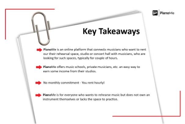 PianoMe is a growing online platform that enables musicians, music schools, studios, churches, and private hosts to rent out rehearsal spaces with instruments by the hour. At the same time, musicians can book affordable practice rooms exactly when they need them—no long-term contracts, no unnecessary costs.